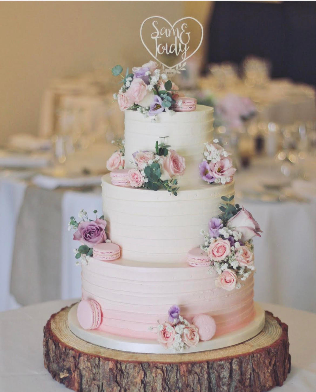 Add a personal flair with a topper that includes your names and wedding date. Available in materials like wood, acrylic, or glass, these can be personalised to align with your wedding theme or colour scheme.